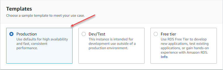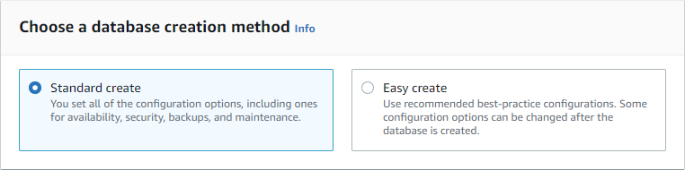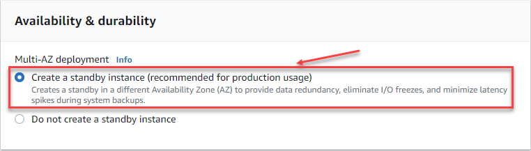 We select the standard create option which allows us to set configuration options including the Multi-AZ deployment model option.