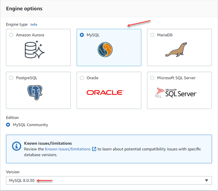 In this example we are going to select the MySQL database engine to create our instance and select the latest version available in production.