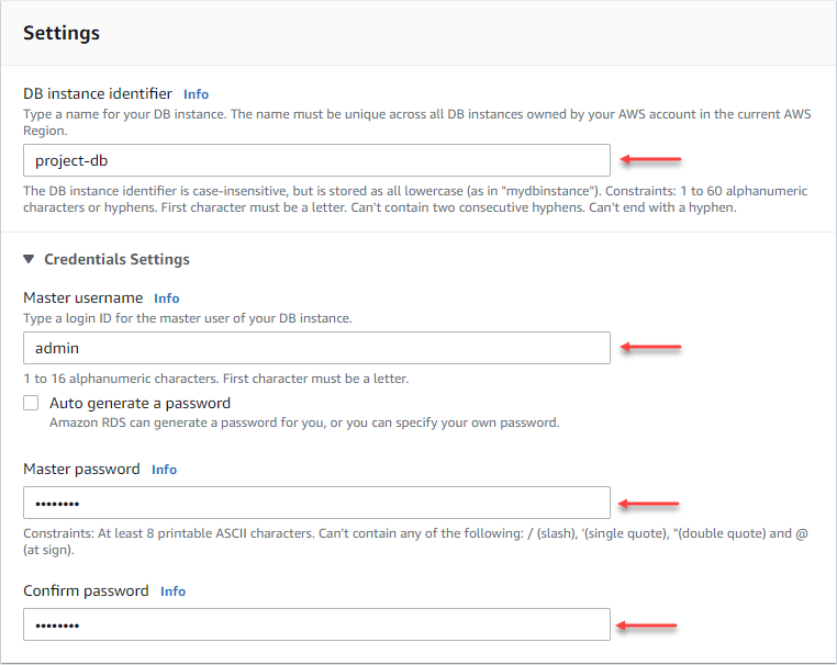 The next step is to define the name of the database instance and we configure a master user with its respective password, complying with the parameters defined by the AWS management console.