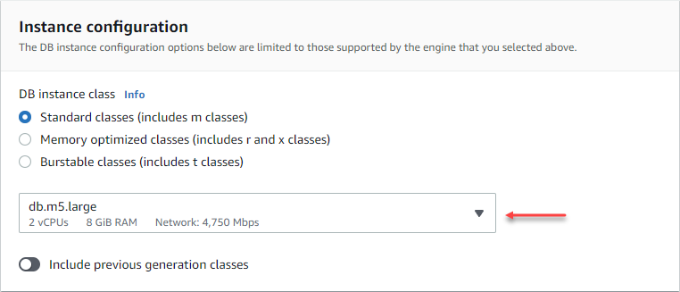 The next step is to select the type of instance for the database that includes the number of vCPUs, RAM, and network. For this practice exercise, I selected the instance with the fewest features.