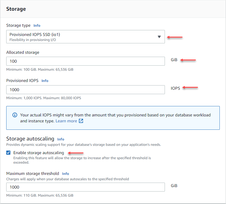 Now we select the storage where our data will be hosted, where we specify the type of disk, its capacity in GiB and the amount of IOPS and if we want our storage to have auto scaling (optional).