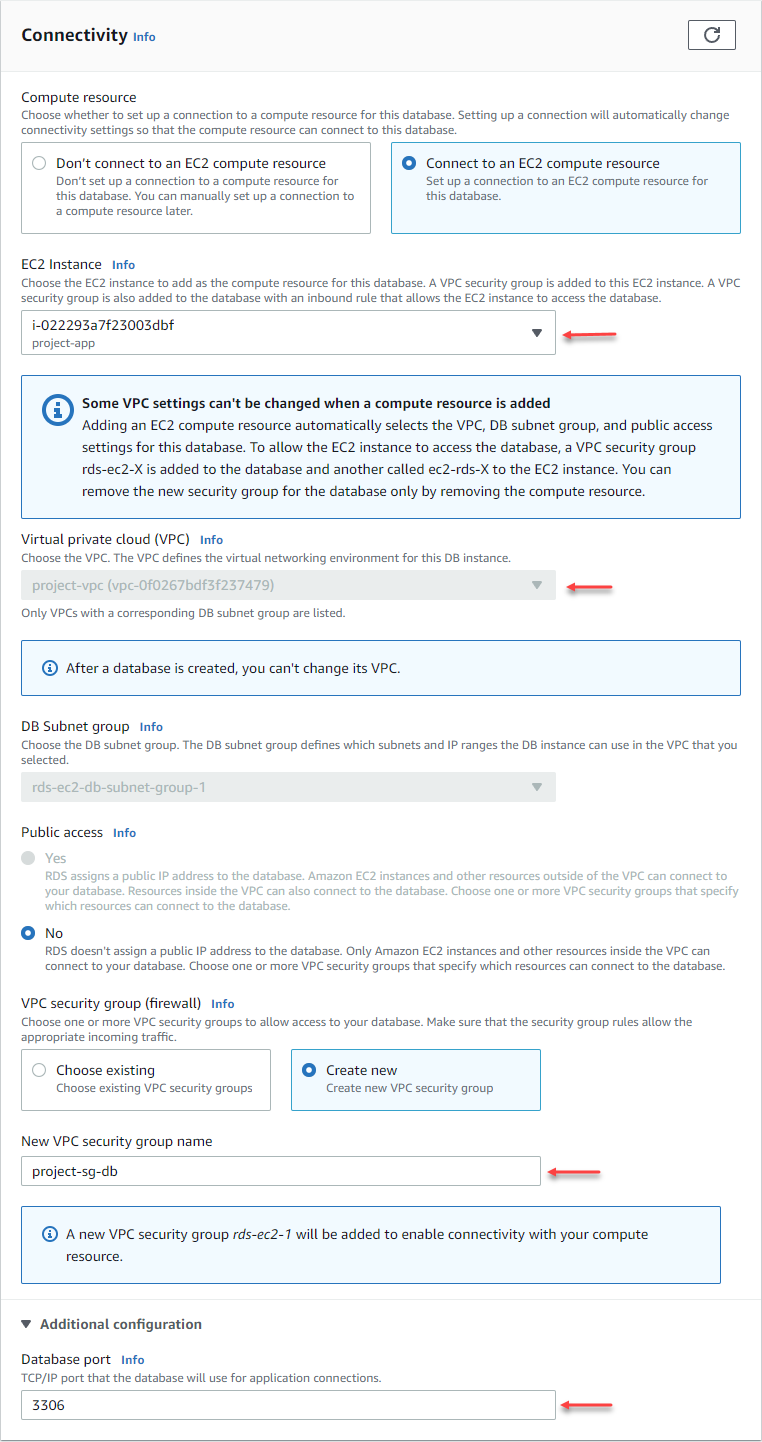 Finally, we configure the connectivity part, where in this case we select the option to connect to an EC2 instance that was the one that we previously created and we select the VPC that is created by default for this region and we add a new security group for the database enabling port 3306 that will serve us for connectivity tests.