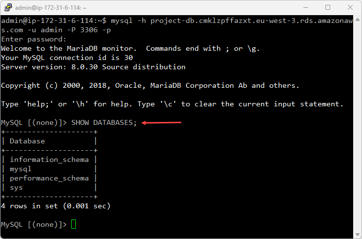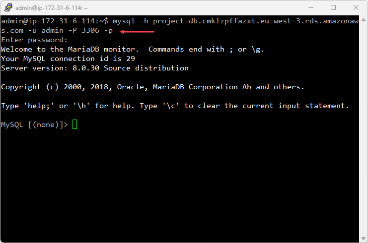 mysql -h project-db.cmklzpffazxt.eu-west-3.rds.amazonaws.com -u admin -P 3306 -p