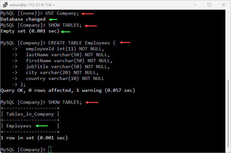 Next, we are going to run a series of commands to the MySQL database engine to create a database, create a table, and insert some sample data.