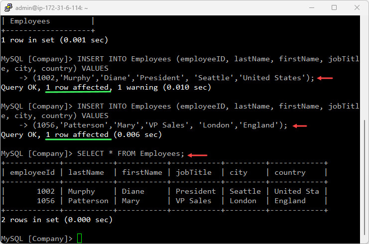 INSERT INTO Employees (employeeID, lastName, firstName, jobTitle, city, country) VALUES (1002,'Murphy','Diane','President', 'Seattle','United States'); INSERT INTO Employees (employeeID, lastName, firstName, jobTitle, city, country) VALUES (1056,'Patterson','Mary','VP Sales', 'London','England'); INSERT INTO Employees (employeeID, lastName, firstName, jobTitle, city, country) values (1102,'Bondur','Gerard','Sales Manager EMEA', 'Berlin','Germany'); INSERT INTO Employees (employeeID, lastName, firstName, jobTitle, city, country) values (1567,'Castillo','Paola','Sales Rep', 'Madrid','Spain');