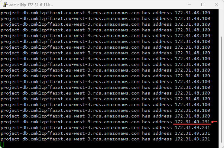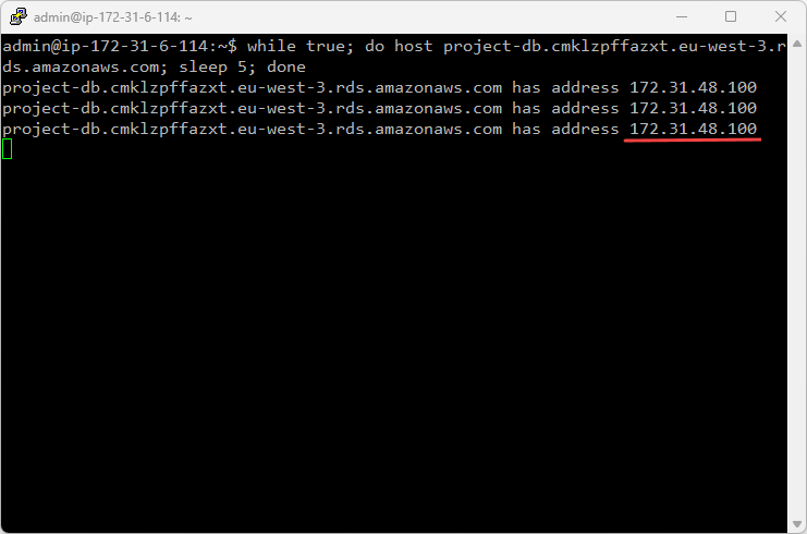 while true; do host project-db.cmklzpffazxt.eu-west-3.rds.amazonaws.com; sleep 5; done