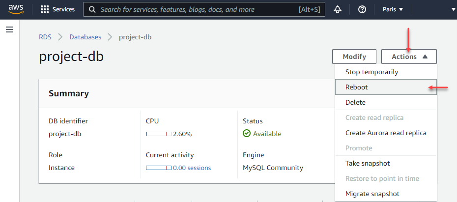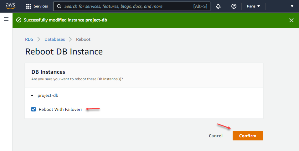 To verify that the failover is done, we do is a reboot to the Amazon RDS DB instance from the AWS Management Console.