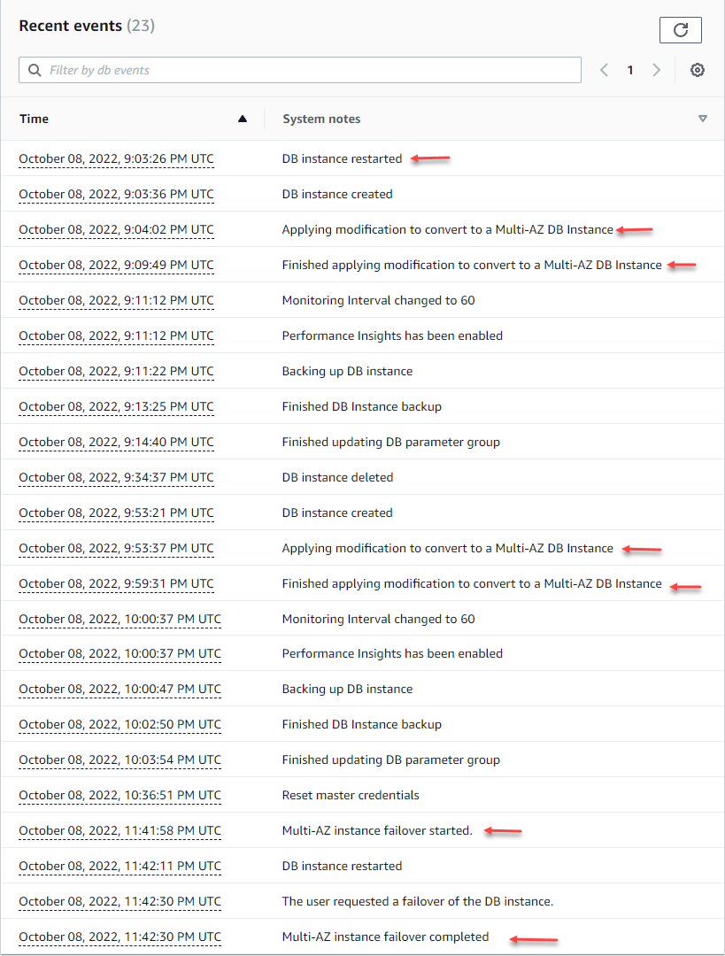 Finally, we check the Amazon RDS (MySQL) instance events in the AWS Management Console to verify that it has made the failover and the Multi-AZ deployment model has been applied.